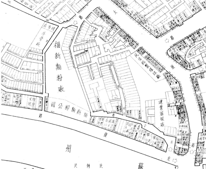 1912年底,为进一步扩大面粉的生产规模,振兴国货品牌,荣氏兄弟决定在全国工商业中心上海,组建新厂一一上海福新面粉厂,近代上海最大的私营机器面粉厂。厂址毫无悬念地选择苏州河畔,光复路423—433号,原因无非有二:一是毗邻苏州河航运便利,水道连通,进货和发货都极为方便;二是同类产业聚居,光复路一带米行遍布,北福建路又是北米市场,同为下游行业的面粉厂设在此处,得天独厚。