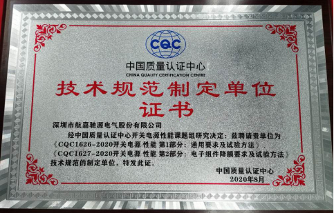 近日,由中国质量认证中心(英文简称“CQC”)举行的开关电源性能分级认证技术规范宣贯会暨双认证电源名企百家行活动在深圳天安云谷举办。开关电源性能分级认证标准由《CQC1626-2020 开关电源性能 第1部分:通用要求及试验方法》与《CQC1627-2020开关电源性能 第2部分:电子组件降额要求及试验方法》两部分标准组成。宣贯会上,航嘉作为标准的主要起草单位,荣获了“技术规范制定单位证书”。