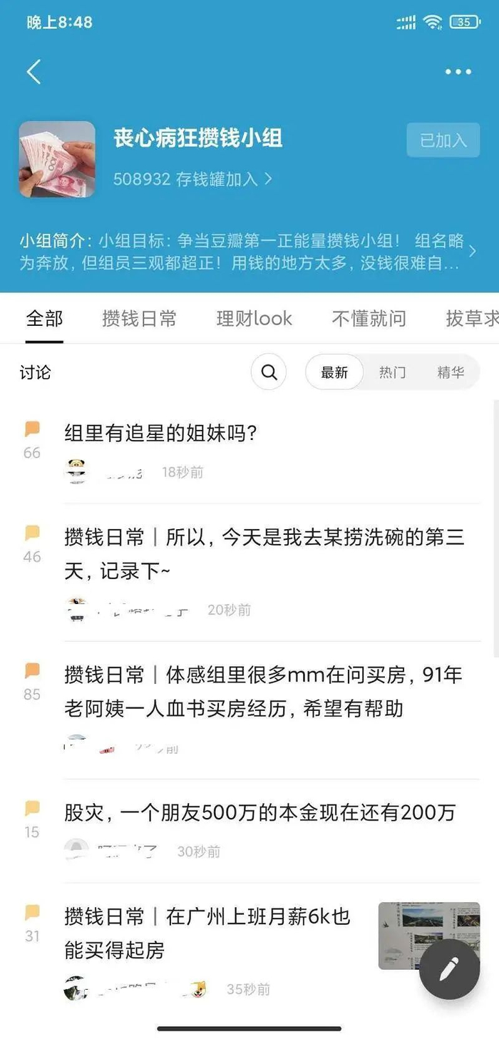 其实我很早就加入了一些社交网站的省钱小组,如“丧心病狂攒钱小组”等等。至少我觉得对我是很有意义的,首先很实用,知道了可以在哪些地方省出不必要花的钱。另一方面就是,你不会觉得只有自己生活得那么辛苦。 图 / 网络截图