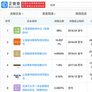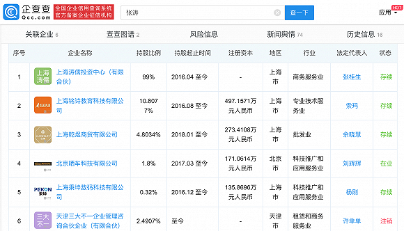 据了解,张涛在教育领域布局颇广。企查查信息显示,2016年,张涛就参与了对早教托班上海铭诗教育科技有限公司(袋鼠麻麻)的投资,持股10.8%。今年8月17日,在线少儿英语教育品牌“伴鱼”宣布完成1.2亿美元C轮融资,张涛是领投方之一。