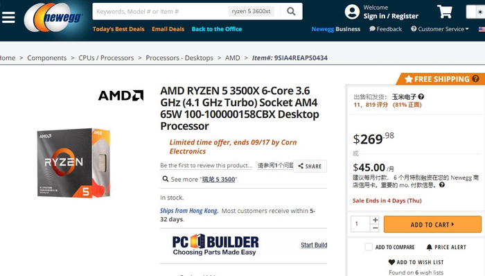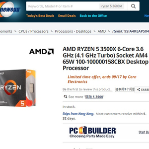 9月14日消息 据外媒 TomsHardware 今日报道,新蛋(Newegg)上线了 AMD 中国区特供的 Ryzen 5 3500X 处理器,售价 269.98 美元,相当于国内 999 元的售价加倍。