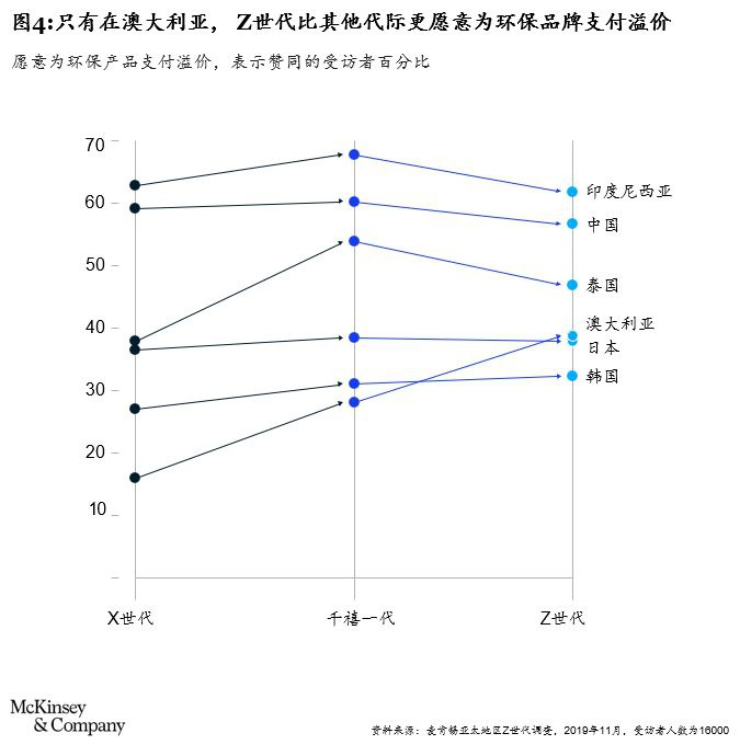 在环保意识之外,60%~80%的Z世代受访者认为品牌应对自身行为负责。但只有在澳大利亚,Z世代(39%)比千禧一代(28%)和X世代(16%)更愿意为环保产品多付费(见图4)。