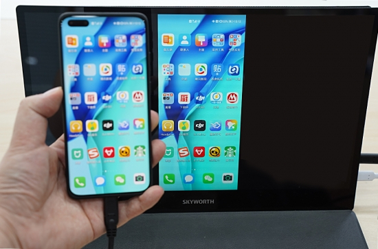 同样,用一根Type-C连接线,手机设备可以快速与显示器互联,得益于屏幕具有的十点触控操作,即可在大屏上操作手机应用程序。