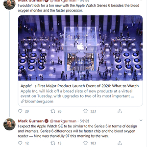 Gurman称,Apple Watch 6变化不大,除了更快的处理器和血氧饱和度监测功能。另外,苹果此番还将推出更加廉价的Apple Watch SE,两款手表都可选40mm和44mm表径。