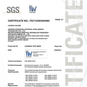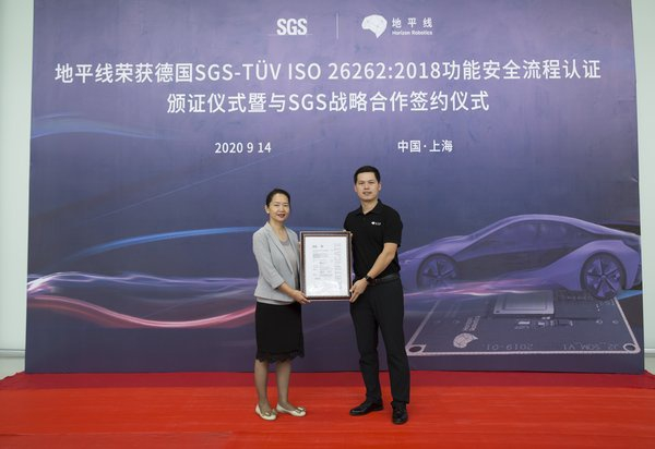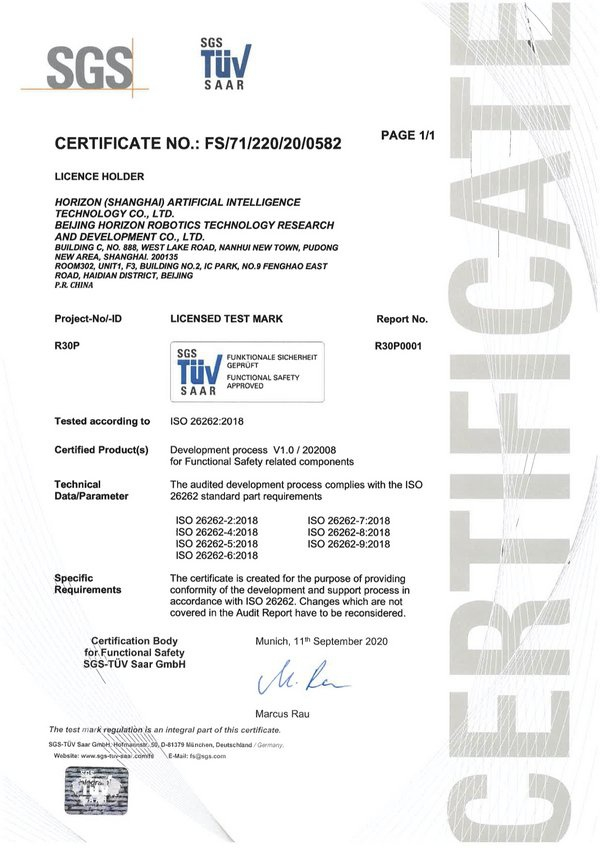 9月14日,全球知名的检验、鉴定、测试和认证机构SGS TÜV Saar(全球功能安全技术中心)于上海向地平线颁发了ISO 26262:2018功能安全流程认证证书。