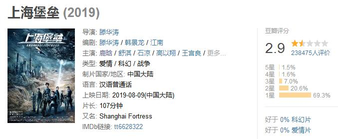 当然有的人可能觉得这个分数在一众8.5面前就是渣渣,但鹿晗的上一部作品,还是一年前被宣告长期钉在中国大银幕耻辱柱上的豆瓣2.9分科幻巨作《上海堡垒》。