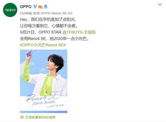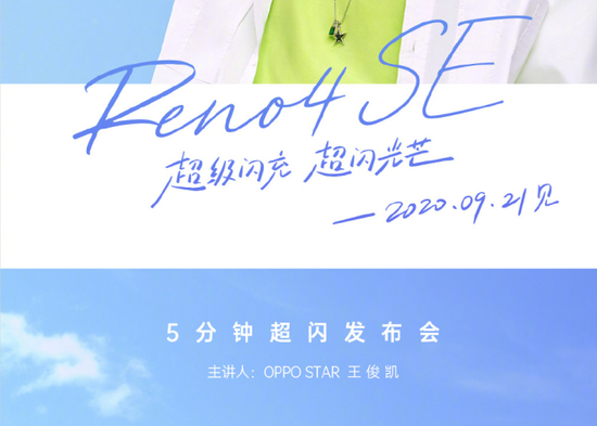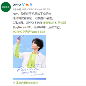 9月15日,OPPO微博正式曝光了Reno4 SE,海报中王俊凯手持OPPO Reno4 SE。不同于Reno4系列的晶钻工艺机身,这次的OPPO Reno4 SE机身采用了全新设计,在不同角度的光线照射下会呈现出多种的光芒效果,相较于传统的渐变色机身,有着更加时尚的机身观感。