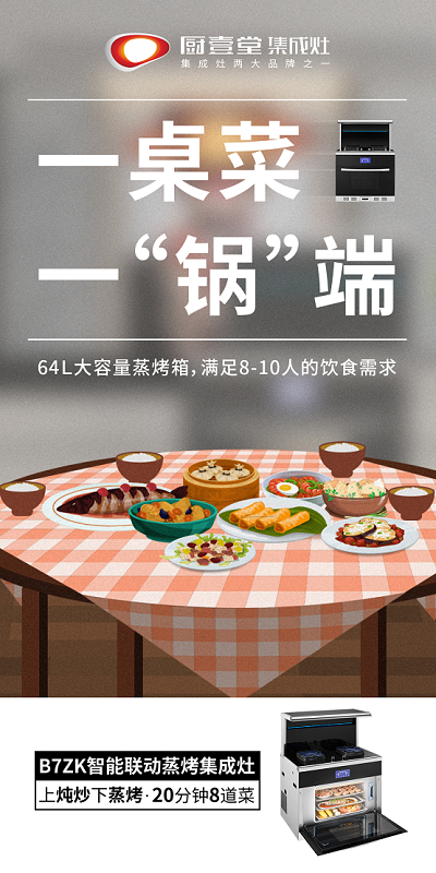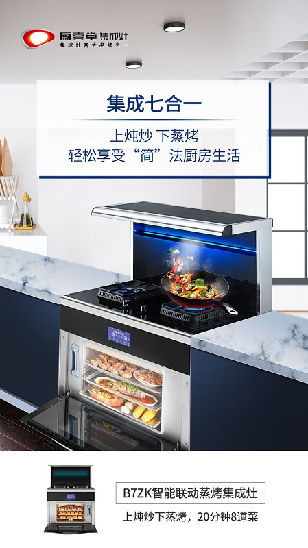 拥有厨壹堂B7ZK集成灶,64L大容量蒸烤箱,一次就能搞定一桌好菜,轻松满足全家人美食需求。蒸,双倍大蒸汽,蒸出中国味;烤,3D立体烘烤,面面俱到;蒸烤联动创新组合,先蒸后烤,先烤后蒸,外酥里嫩,口齿留香。