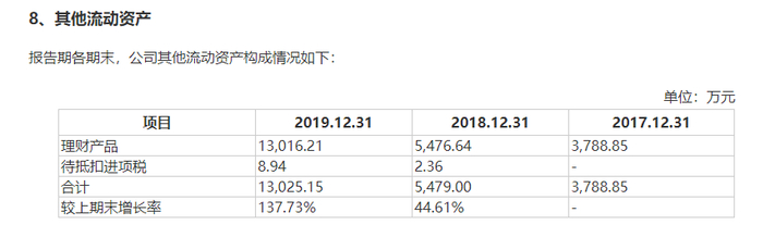 可以发现,公司2019年末的理财产品比上期末增长138%,但当年的理财产品收益却只增加了70万元。