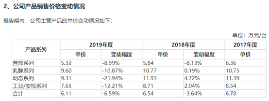 2017年-2019年,普放系列的产品单价分别为6.36万元、5.84万元、5.32万元,变动幅度分别为-8.13%、-8.99%;动态系列的产品单价分别为11.39万元、11.93万元、9.31万元,变动幅度分别为4.72%、-21.94%。