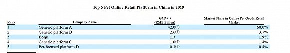 波奇网在招股书中提到,中国的在线宠物用品零售市场行业竞争十分激烈,具有许多大型且成熟的在线零售平台。通过2019年GMV来进行排名的话,第一名是淘宝,占据市场份额60%,第二名是京东。第三名的波奇网仅占据市场份额的1.9%,是淘宝市场份额的1/30。