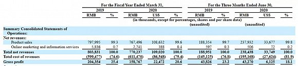 截至2019年12月31日及2020年3月31日的财年,公司销售产品所产生的净收入分别为7.98亿元以及7.675亿元,分别占同期净收入总额的99.3%和99.6%。在2020年的第二季度,公司销售产品带来净收入2.379亿元,占同期净收入总额的99.8%。