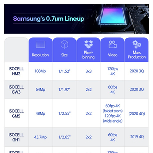 这四个CMOS分别为1亿800万像素的HM2、6400万像素的GW3,4800万像素的GM5以及3200万像素的JD1,它们相比0.8μm单像素的CMOS均要缩小15%,并可让相机模块的高度减少了10%。由于外形尺寸较小,因此这4颗CMOS可以有效缩小智能手机中相机凸起的部分。