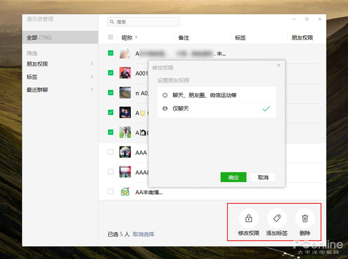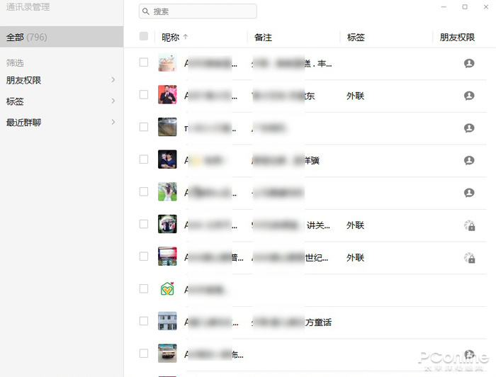 第二个变化是新增加的“通讯录管理”,这个……其实也是PC版的刚需,毕竟PC端的操作效率还是远高于手机端的。打开新版微信“通讯录”,可以在置顶区看到新增加的“通讯录管理”,点击后是一个带有搜索框的独立窗口。整个逻辑有点像QQ的好友管理器,可以对朋友圈动态(不让他看/不看他的)、朋友圈权限(仅聊天/聊天、朋友圈、微信运动等)等进行修改。
