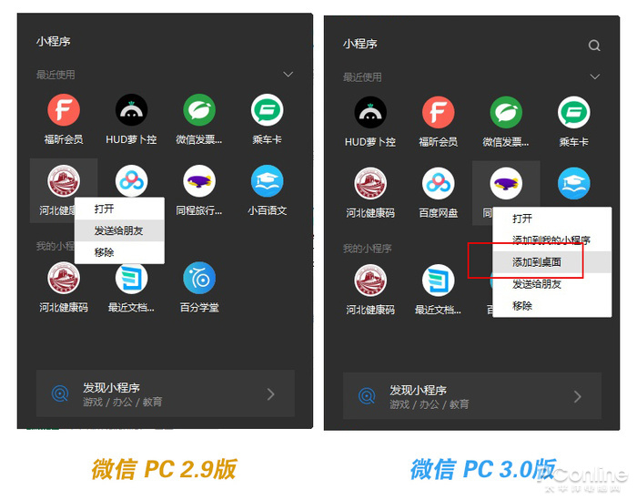而在此次更新的PC端3.0版中,我们终于“欣喜”地看到右键菜单中增加了一项“添加到桌面”功能。点击这个选项后,即可将小程序链接发送到桌面上,来实现小程序的一键直达!