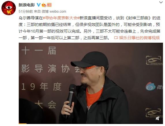 “(《封神三部曲》)三部的前期拍摄已经结束,但很多视效团队是国外的,可能会受到影响,预计今年10月第一部的视效可以完成。另外,三部不太可能会连着上,先会完成第一部,第一部一年后可以上第二部,之后再第三部。”