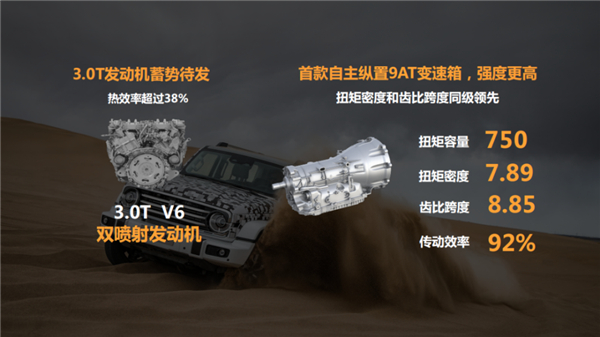 而据官方透露的信息显示,长城自研的3.0T发动机也将会首先搭载于坦克300车型上,其最大功率516匹、峰值扭矩750N·m。与之匹配的则是长城自研的中国首款纵置9AT自动变速箱。