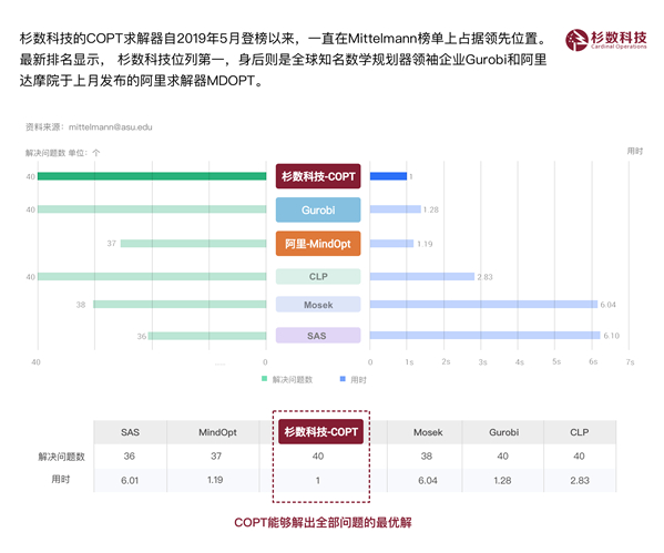 国内专注于人工智能与数学规划商业软件的杉数科技,在国际权威第三方测评Mittelmann最新一轮测试结果中,稳居单纯型法线性规划求解器全球性能第一。值得一提的是,杉数科技的COPT求解器自2019年5月登榜以来,一直在Mittelmann榜单上占据领先位置。最新排名显示, 杉数科技持续位列第一,身后则是全球知名数学规划求解器领袖企业Gurobi和阿里达摩院于上月发布的阿里求解器MDOPT。