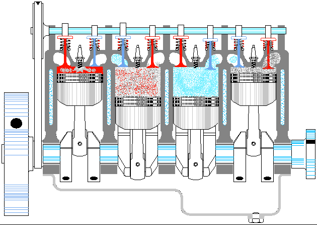 传统汽油发动机,在进气冲程(活塞在气缸中向下运动)中吸入混合空气和燃料,然后在压缩冲程结束(活塞在气缸中向上运动)用火花塞点燃。砰!类似一种爆炸,汽油爆发出巨大的能量,推动活塞送回下至点,将燃料燃烧的能量转移到曲轴上,使发动机旋转。当活塞再次上升时,排气阀打开,燃烧副产品被推出燃烧室,循环重新启动。