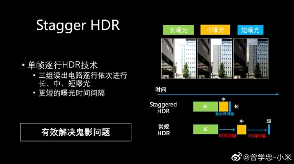 不仅如此,为了解决多帧HDR算法带来的伪像问题,小米10至尊纪念版采用了芯片级单帧逐行HDR技术(业内也称为Stagger HDR技术)。