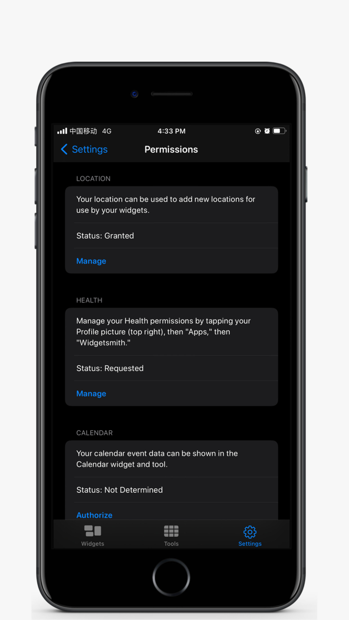 在设置小部件前,别忘了前往“Settings”-“Options”-“Manage Permissions”授予该 App 权限。