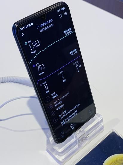 28日上午在厦门SM广场,我们也体验了在中国移动5G网络覆盖下,vivo iQOO 5G工程版手机的室内测速情况。测试显示,全速5G卡的下行速率峰值达到1353Mbps,上行最高79.1Mbps。