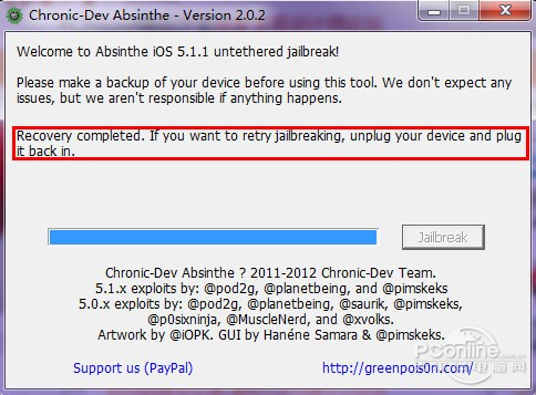 遇到iOS5.1.1完美越狱工具崩溃、出错,导致无法成功越狱的朋友,可以借鉴一下这种方法,待iOS5.1.1完美越狱后,再用iTunes的备份还原功能还原之前的手机设置和应用数据即可。