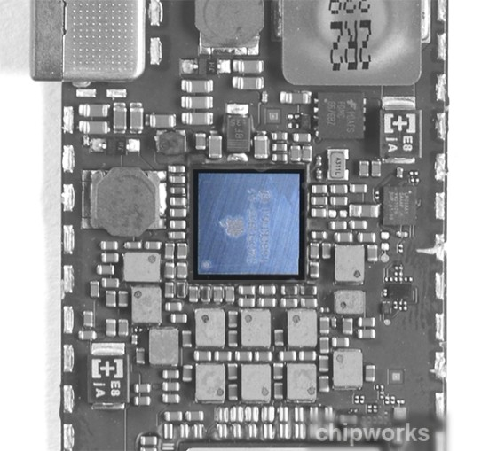 在A7处理器的旁边,一堆电感、电容中间有颗印有苹果标识的芯片,上边只有个编号“343S0655-A1”。