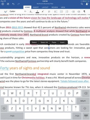 对比Office Web应用和Office for iPad将发现,两者只是几个步骤的差异罢了。比如说,你可以给一段文字添加形状或脚注, 但iPad版则没有这样的功能。除此之外,两者的其他功能都是相同的。两者都有自动纠错功能,但iPad版Office没有语法纠错或百科。 一些更专业的用户可能会发现iPad版Office缺失了一部分段落格式选项。