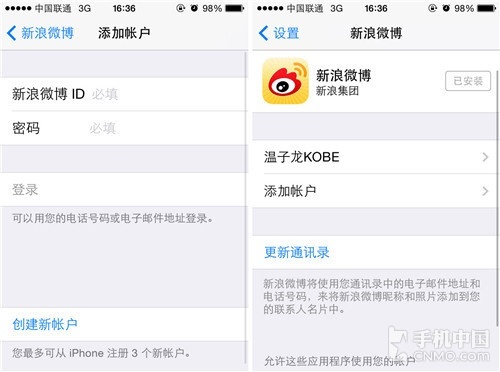第三步:选择“添加账户”,之后输入自己新浪微博的账户和密码,并通过验证登陆。