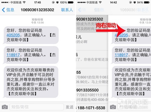 笔者首先要说的这个手势操作非常实用,几乎适用于所有应用和界面。笔者在这里就拿大家最常用的短信界面举例,经常使用iPhone短信功能的用 户在看完一条短信之后想返回上一级界面一般都会点击左上角的“信息”按钮,其实我们只要将手指放在屏幕左侧边缘向右滑动,就可以返回到上一级界面了,对于 喜欢单手操作的用户来说非常实用。
