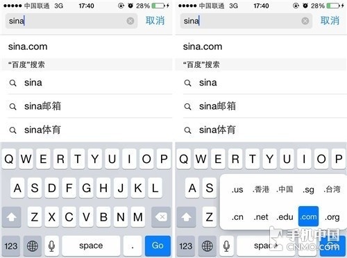 当我们在日常生活中发短信和上网时,某些时间会需要用户输入网址的后缀名,诸如“.com”,“.net”,“.cn”等等,一个字一个字的打 是非常费劲的,其实我们只需要把键盘切换到全字母键盘,然后长按句号按键,就可以在句号上方看到iOS 7系统为用户提供的URL后缀选项了,非常方便。