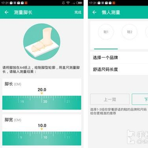 首次使用软件的用户可以通过“懒人测量”和“更精确测量”两种方式,获得软件为其推荐的尺码,选择前者,需要用户输入3双合脚鞋的尺码,而后者则需要用户测量自己的脚长、脚宽及脚围。小编认为为了使推荐的尺码更加准确,用户最好选择后者。