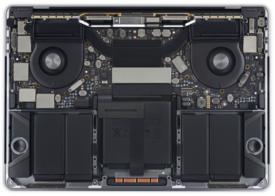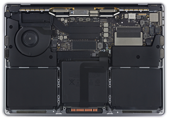 再次,非 Touch Bar 版本的散热系统相对有缩水,非 Touch Bar 版本只有一个风扇,而 Touch Bar 版本有两个,具体可以看下图的比较,上面的为 Touch Bar 版本,下图为无 Touch Bar 版本,图片来自 ifixit。