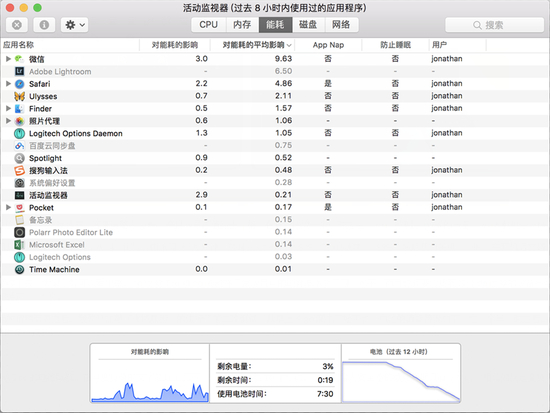 而就在今天,在我被催稿两周之后,我快马加鞭(火烧屁股)的进行了第二次测试,从早上 8:30 满电开始工作,电池的消耗情况如下:在 7 个半小时之后,电池全部耗尽(作为对比,2016 款的 Pro 坚持了 7 个小时多一点)。