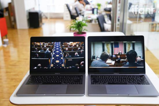 顺便说一句,虽然从参数上看,2017 款 Pro 的屏幕还是沿用的 2016 款的那块最高亮度 500 尼特,P3 广色域的屏幕,但我们手头拿到的 2017 款 Pro 明显在可视角度上有很好的优化,在倾斜 45 度以上的时候,2016 款(图左)出现了明显的偏色而 2017 款没有。