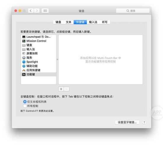你也能设置打开某个软件时,就显示 F1-F12 键。在‘键盘 – 快捷键’就能添加指定的软件。第三方工具 TouchBarSwitcher 也具备此项功能。