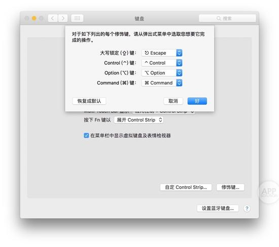 很多人都抱怨 TouchBar 上的虚拟 Esc 键没有手感。不过 macOS 提供了一个让 Esc‘实体回归’ 的方法。在键盘设置中,右下角的‘修饰符’中可以将‘大写锁定’按钮重映射成‘Escape’键。