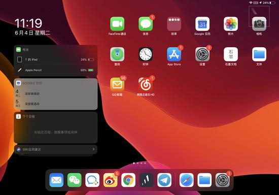 和以前的布满 app 图标的主屏幕不一样,iPadOS 将主屏分割为了 1:2 的区域,在左侧的区域放置了‘今天’视图,你可以方便地在这里查看和使用小组件功能,而无需再像以前一样滑动到‘负一屏’才能使用。