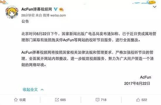 而早在今年4月,A站已经对影视方面的相关视频资源进行了大动作调整,不仅美剧专区被撤销,美剧也几乎全部沦陷,而在6月22日,广电总局也曾发布通知,要求新浪微博、ACFUN、凤凰网等平台关停视听节目服务,原因是其不具备《信息网络传播视听节目许可证》。