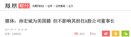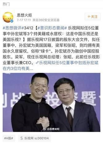 但就在孙宏斌“美国人”身份曝光后,中国社会科学院国家文化安全与意识形态建设研究中心官微发布了题为“乐视网拟任5位董事中,孙宏斌等3人持美籍或永久居住权:这是中国乐视还是美国乐视”的消息。此外,也有网民调侃称“乐视网已经成了外资控股”。