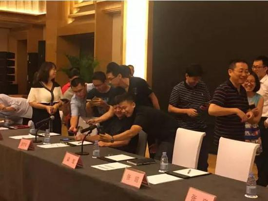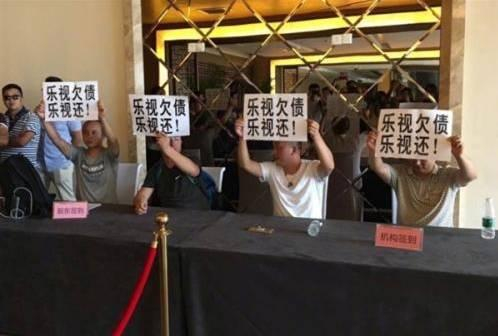 屋内股东们光鲜亮丽的合影与屋外此起彼伏的讨债声形成了鲜明对比。早在开会之前,北京博豪瑞廷会议现场签到台关卡就已经被供应商”攻破”。讨债的供应商举牌围堵,他们推翻签到桌,围堵会议现场,要求面见乐视创始人贾跃亭,高呼还钱。
