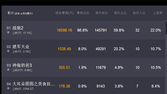 目前,据猫眼票房数据显示,截止8月2日,《战狼2》上映7天,票房已累计超17亿,日票房占比最高超80%,平均一天超2亿的票房走势不仅连破多项票房纪录,更被业内预测将超越《美人鱼》的30亿,再创票房神话。在业内人士看来,《战狼》系列的火爆将为电影市场带来新的风向,军事动作片、中国式超级英雄将引领新的市场风潮。