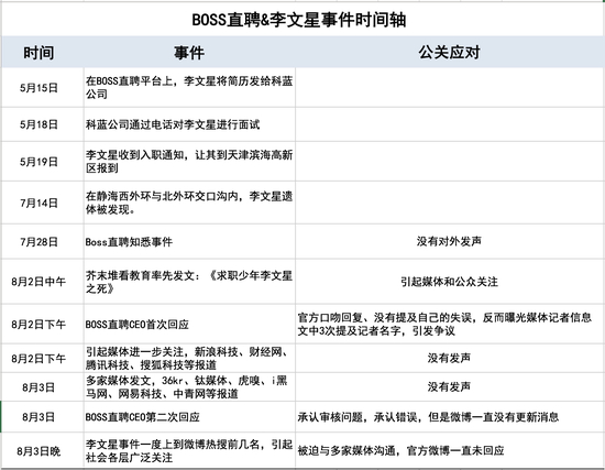 7月28日,Boss直聘已经得知李文星身亡的信息后,但并没有及时对外发声,也没有任何反应。企图用时间来掩盖这件事。这也是很多企业通用的做法,在危机发生后,总是试图拖延,看看危机是否会被自动掩盖甚至消失。