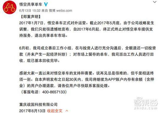 6月13日,悟空单车在微博上正式发出公告,宣布自6月起停止服务,退出共享单车市场。在此前数天,创始人雷厚义和团队成员中止项目的行为无声而悲壮——将找回的近500辆共享单车悉数送人。