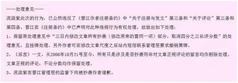 但晋江管理层在认真通读了《后宫·甄嬛传》后,发现该文,有大大小小30多处情节、语句和《斛珠夫人》、《寂寞空庭春欲晚》、《冷月如霜》、《双成》、《春衫薄》、《枕中记-之青城外传》、《冷宫》等多篇文章存在相同或相似之处。最终,晋江论坛做出流潋紫公然违规,且应向被抄袭者道歉的判定。