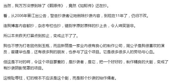 除了《甄嬛传》,《如懿传》也存在抄袭嫌疑。在《今日踩原创,请从匪我思存始》一文中,匪我思存言语间多少有些无奈道“11年了,仍旧不变。”