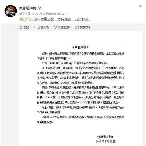 除了《三生三世十里桃花》,唐七的《九州·华胥引》也没能“幸免于难”。受到抄袭风波的影响,《鲛珠传》电影官方于8月12日发表声明称,该片并非改编自唐七的《九州·华胥引》,而是原创剧本,拨正“电影改编自抄袭小说”的谣言。