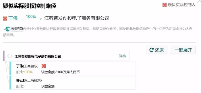 从几个核心人物的名字不难看出,这是一个家族企业集团。其中,比较敏感的“江苏普发创投电子商务有限公司”就是推出理财App“普发贷款”的公司,这个公司在今年涉嫌非法吸收公共存款,已经停止运营。其实际控制人正是丁伟。