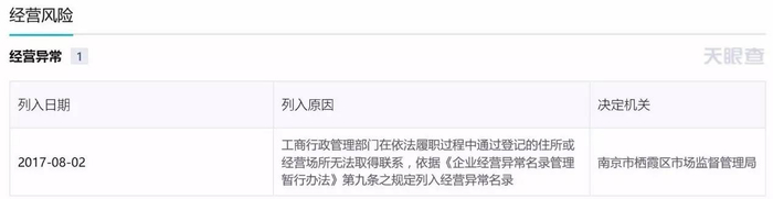 天眼查上的“南京铁拜”也显示企业异常信息。原来这家公司在工商那里也已失联。
